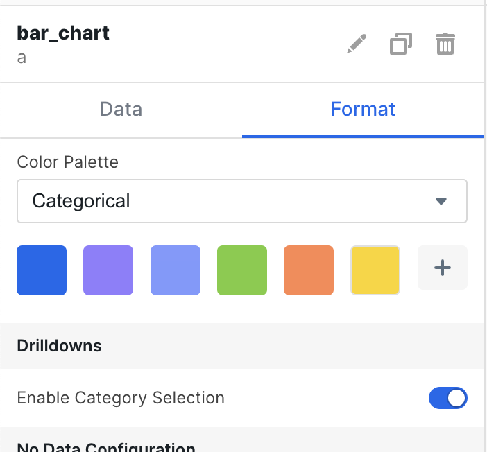 The first step to setting up the drilldown is to enable it in the bar chart itself. In the config you can enable category selection in the drilldown menu. Select the option to turn on the drilldown.