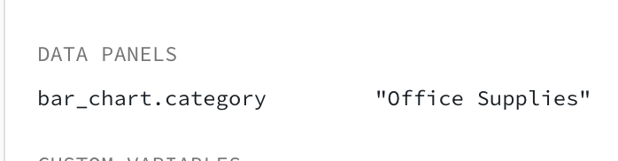 When drilldown is turned on for that bar chart, a variable will be created for that chart. The underlying value will be assigned to a variable with the formatchart_id.category as shown below.