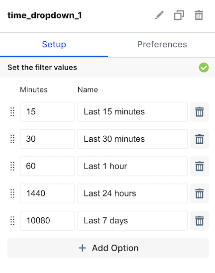 | Set Filter Values | In this section, you can add and reorder options your users can select from. You choose the name of the value (ex. Last 7 days) and the minutes that represents (ex. 10,080). |