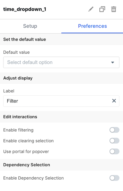 | Enable Dependency Selection | When enabled, you may create a dependency between this element and other elements on the dashboard. When this element is dependent on an element selected, it will be disabled until a value is selected by the user. |