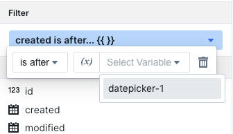 Instead of writing SQL to filter your datasets, you can filter specific data panels by variables directly. To do this, drag the field you want to filter into the Filter section. Then select the Variable option for the filter value input:
