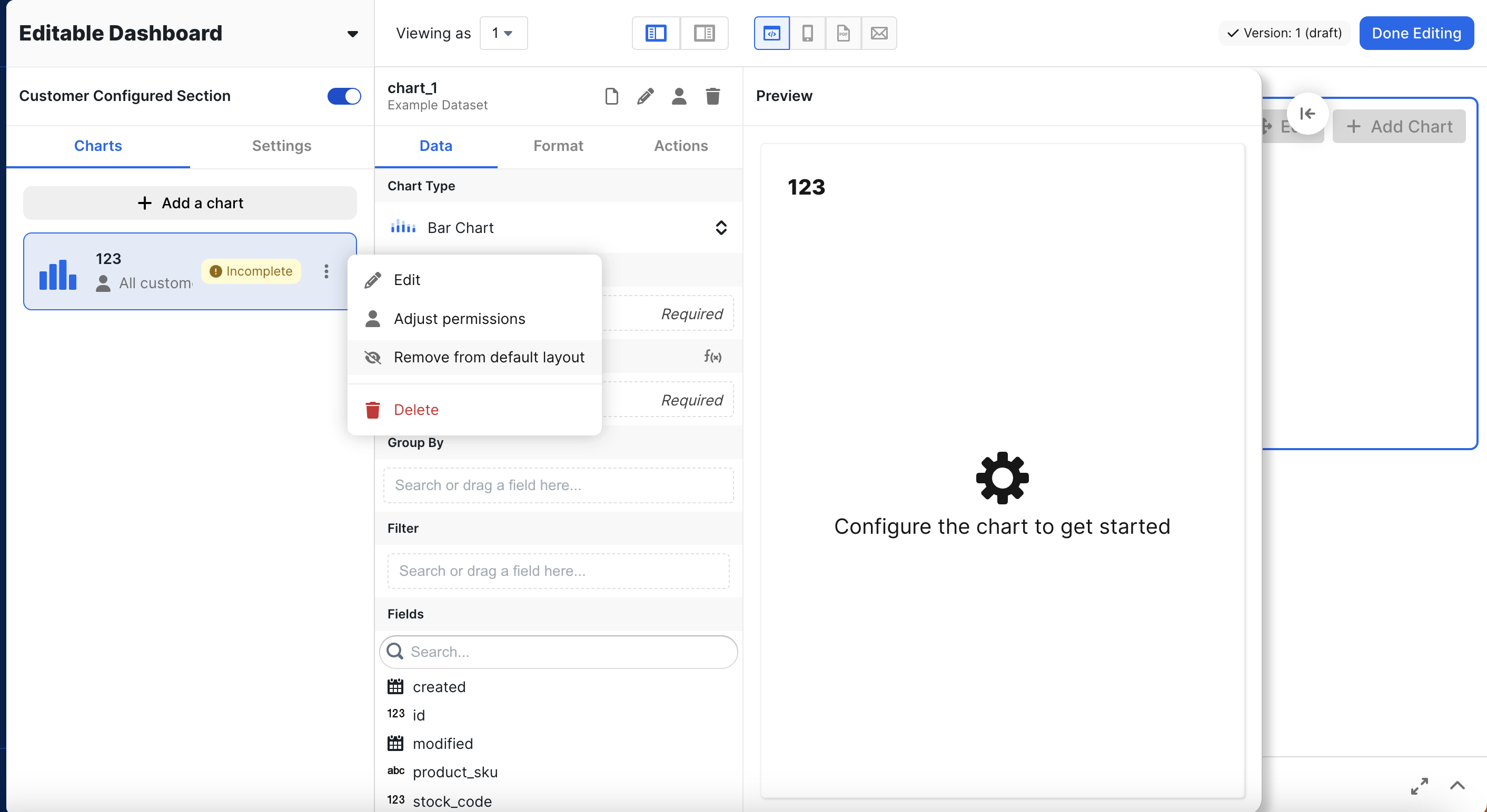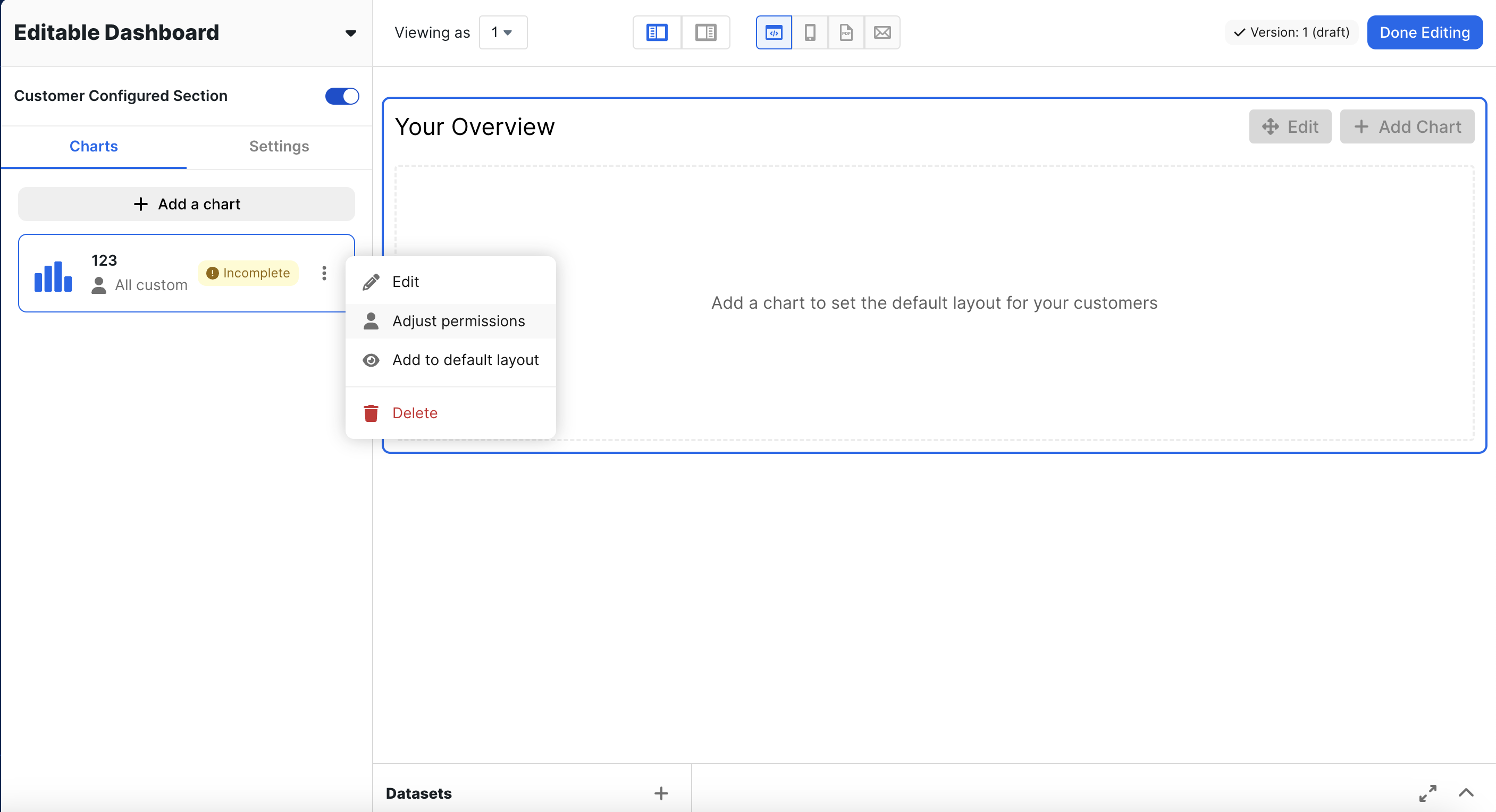 To edit the user permissions on a chart, click the three dots and ‘Edit’. From there, you can change the group tag that the chart is associated with. Each customer can be associated with a Group Tag within the customer object. Typically, group tags will take the form of groups such as Marketing, Sales, Engineering, Leadership, etc.
