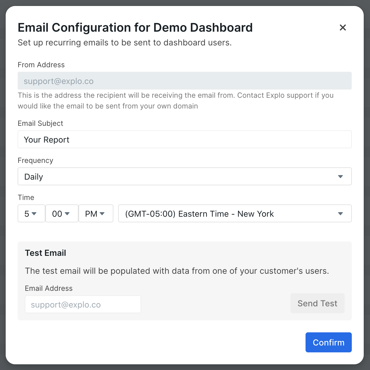 There are three options available for email frequency: daily, weekly, and monthly. The daily frequency sends emails out every day at the given time, the weekly frequency sends out each week on the specified day at the given time, and the monthly sends out on the given occurence of the specified day at the given time. Weekly Frequency Options