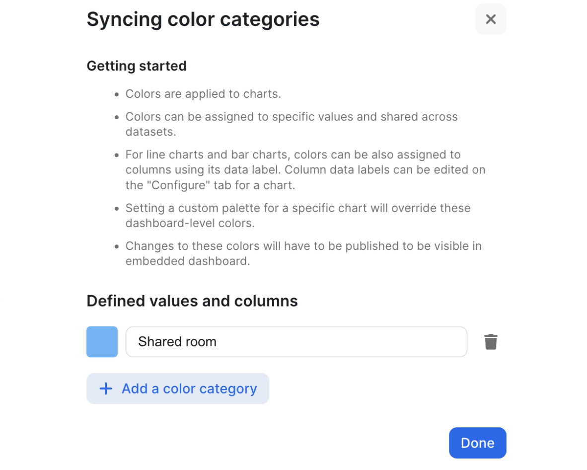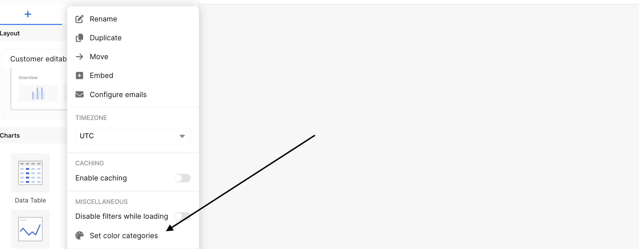 In the top left corner of a dashboard page, the caret dropdown will open up a dropdown with a few different settings, including the ability to set color categories. Click “Set color categories”.