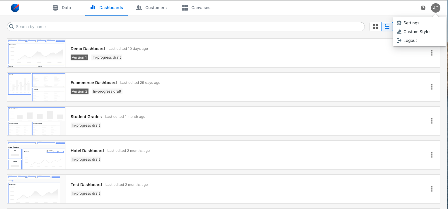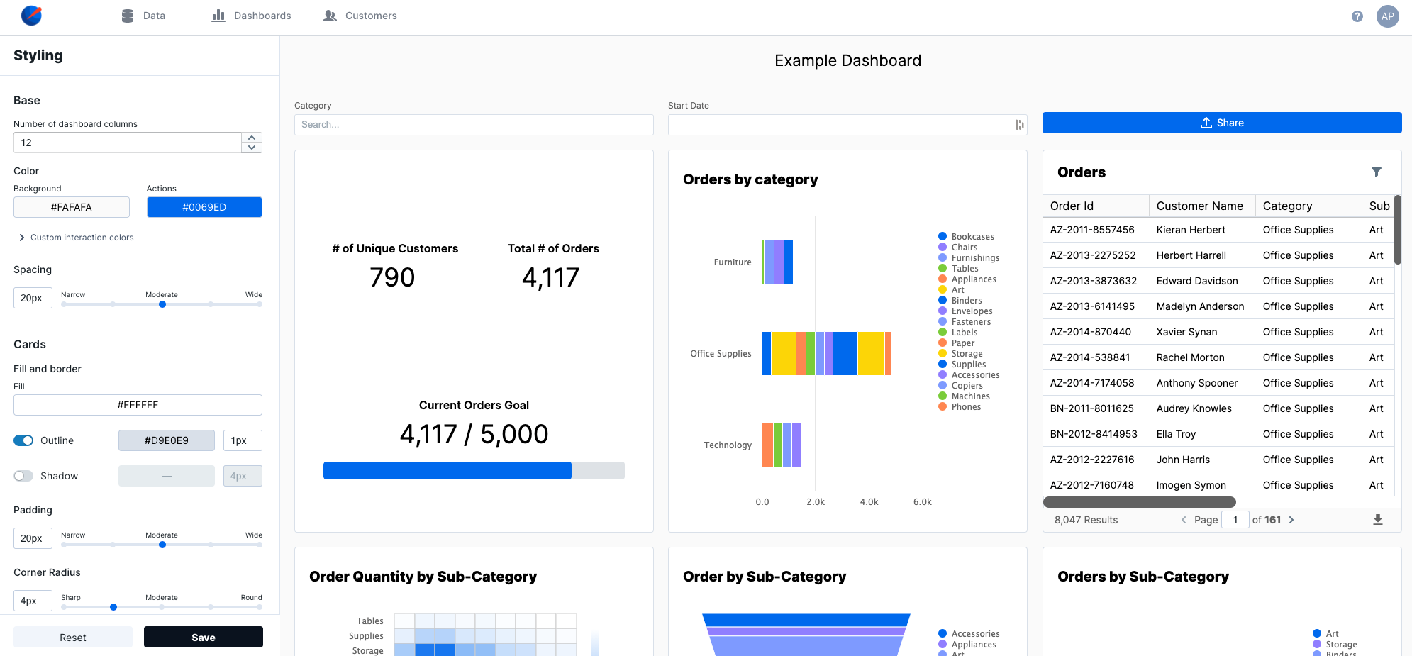You can manage multiple style/theme profiles within Explo. By default, explo displays the ‘default’ theme/style in your embedded components. However, you can pass in the name of a theme/style via the theme prop in the iframe or web component to display a different theme/style.Copy the exact styles from your own application in order to match the design. If