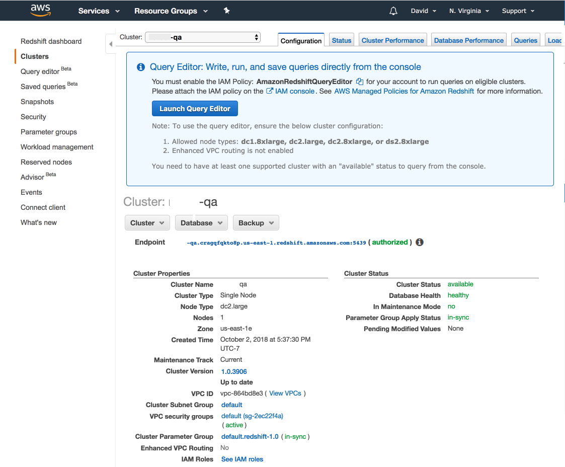 You can find your Redshift cluster details via the AWS console. The Endpoint section gives you the hostname and port all in one. You’ll need to get the database name and a username/password from whoever set up the Redshift cluster.