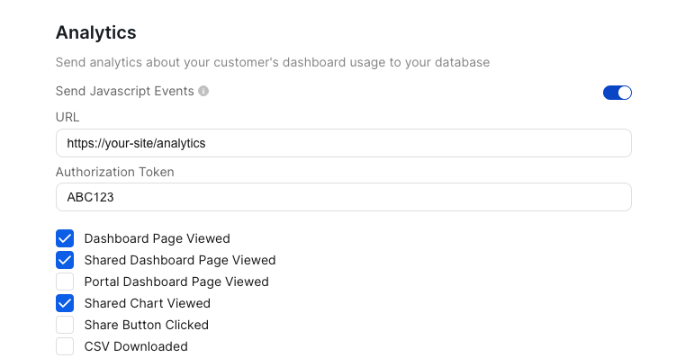 On the settings page, there’s a subsection in the Developers section for Analytics. From here, you can supply a URL and, optionally, authorization token for Explo to send information to and select the set of actions you want reported. Note that the url must be formatted as a valid url withhttp://